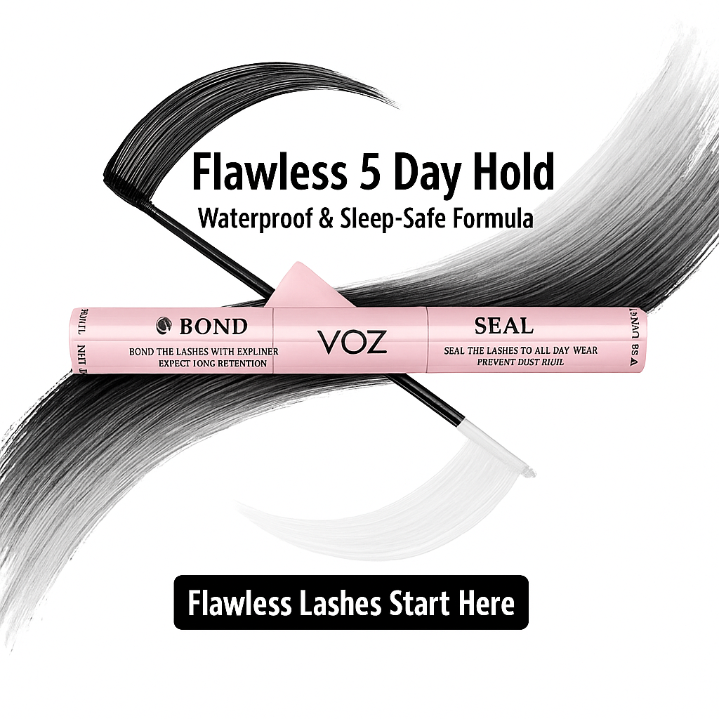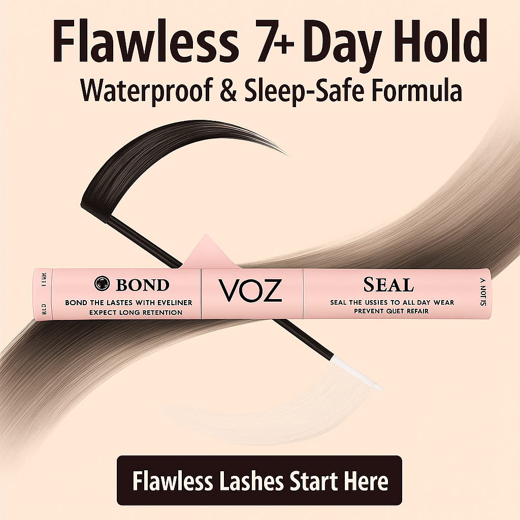 Unlike messy lash glues that lift within hours, VOZ Bond & Seal grips securely, seals away tackiness, and keeps lashes lightweight and natural all day.